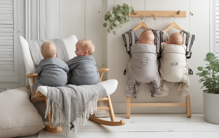 - Komfortpolster – Achte auf dicke Polster an Schulter und Hüfte, atmungsaktive Materialien und ergonomische Sitzflächen, damit du und die Babys lange sicher und bequem bleiben, auch bei längerem Tragen als Doppel-Babytrage, und denk auch an eine Wickeltasche für Zwillinge.