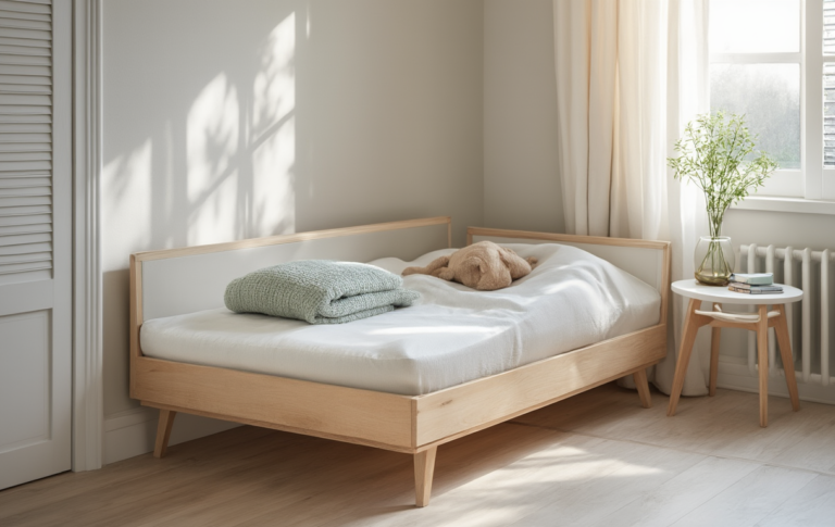 - Sicherheitsbefestigung – Achte auf stabile Gurte oder Halterungen, rutschfeste Füße und geprüfte Verriegelungen; so verhinderst du Kippen und sorgst bei einem Beistell-Bett für kleine Zimmer für dauerhaften, sicheren Anschluss am Elternbett.